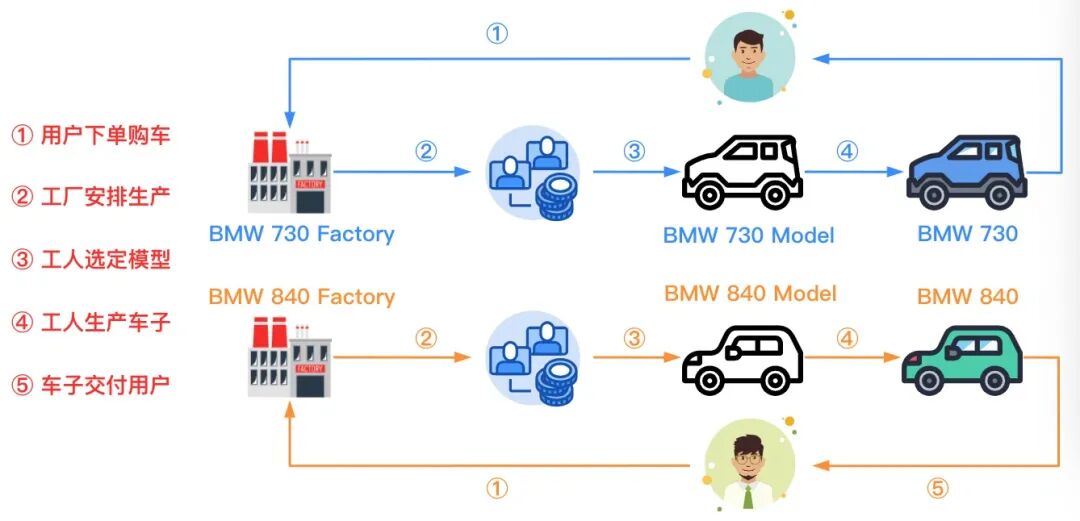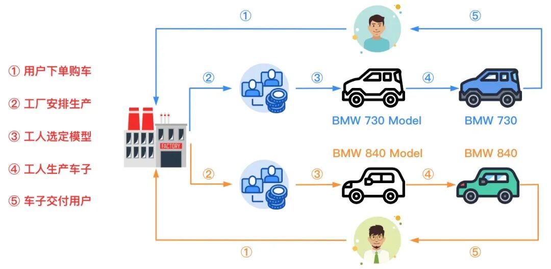 在上图中,阿宝哥模拟了用户购车的流程,小王向 BMW 工厂订购了 BMW730,工厂按照 730 对应的模型进行生产并在生产完成后交付给小王。而小秦向同一个 BMW 工厂订购了 BMW840,工厂按照 840 对应的模型进行生产并在生产完成后交付给小秦。