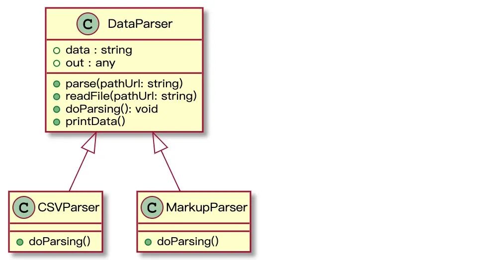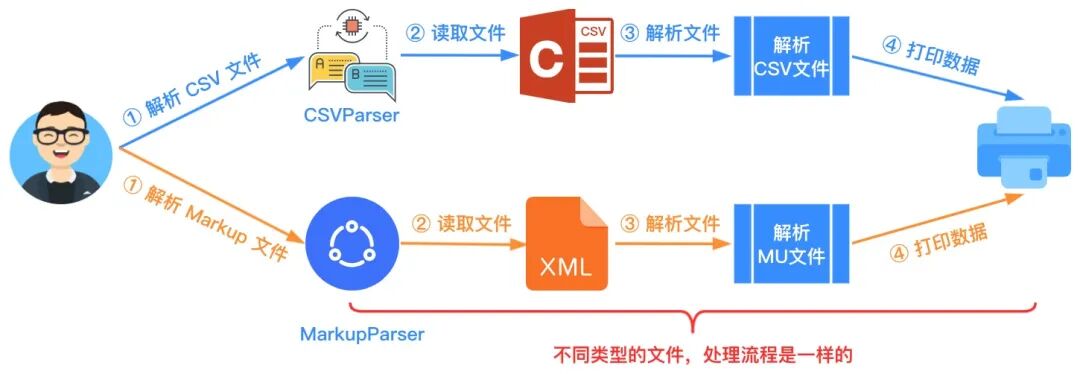 在上图中,阿宝哥通过使用不同的解析器来分别解析 CSV 和 Markup 文件。虽然解析的是不同的类型的文件,但文件的处理流程是一样的。这里主要包含读取文件、解析文件和打印数据三个步骤。针对这个场景,我们就可以引入模板方法来封装以上三个步骤的处理顺序。