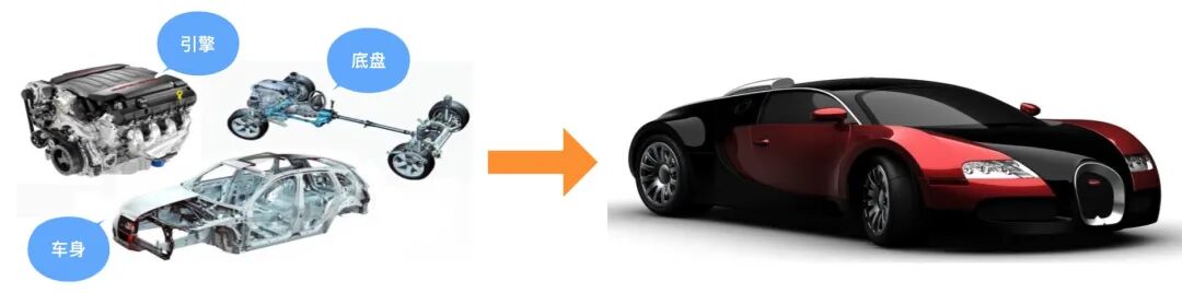 一辆小汽车 🚗 通常由 发动机、底盘、车身和电气设备 四大部分组成。汽车电气设备的内部构造很复杂,简单起见,我们只考虑三个部分:引擎、底盘和车身。