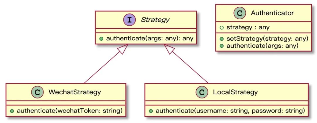 一个系统需要动态地在几种算法中选择一种时,可将每个算法封装到策略类中。 多个类只区别在表现行为不同,可以使用策略模式,在运行时动态选择具体要执行的行为。 一个类定义了多种行为,并且这些行为在这个类的操作中以多个条件语句的形式出现,可将每个条件分支移入它们各自的策略类中以代替这些条件语句。 Github – passport-local:https://github.com/jaredhanson/passport-local Github – passport-oauth2:https://github.com/jaredhanson/passport-oauth2 Github – zod:https://github.com/vriad/zod/blob/master/src/types/string.ts