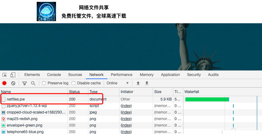 3. 在网址栏输入或粘贴网址,例如输入本站首页“https://netfiles.pw”,然后按回车键。下方的工具栏可能会出现很多行,找到第一行: