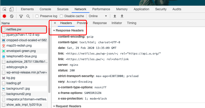$ curl -sI https://netfiles.pw HTTP/2 200 server: nginx date: Sat, 29 Feb 2020 13:29:45 GMT content-type: text/html; charset=UTF-8 vary: Accept-Encoding link: <https://netfiles.pw/wp-json/>; rel="https://api.w.org/" link: <https://netfiles.pw/>; rel=shortlink strict-transport-security: max-age=63072000; preload x-frame-options: SAMEORIGIN x-content-type-options: nosniff x-xss-protection: 1; mode=block